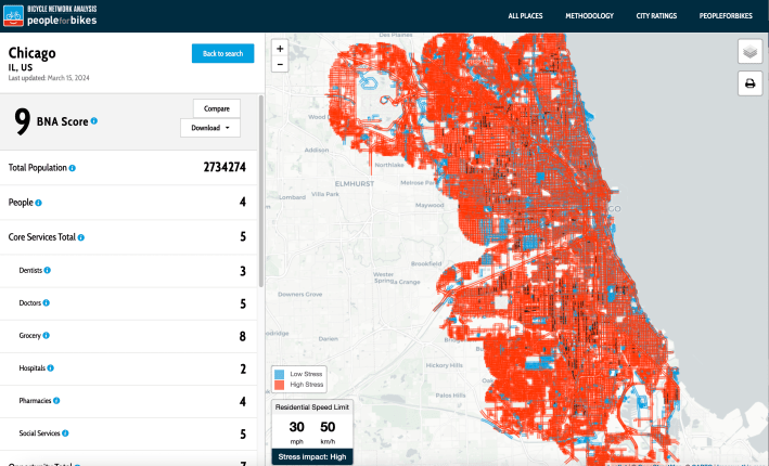 That is, if the City of Chicago changed all our residential street speed limit signs from saying “30” to reading “25”, our City Rating would skyrocket from nine points to 46, more than a fivefold increase. In addition, our already relatively chill residential street grid would magically transform from all-red (“High Stress”) to all-blue (“Low Stress). Personally, I think that’s kind of ridiculous.