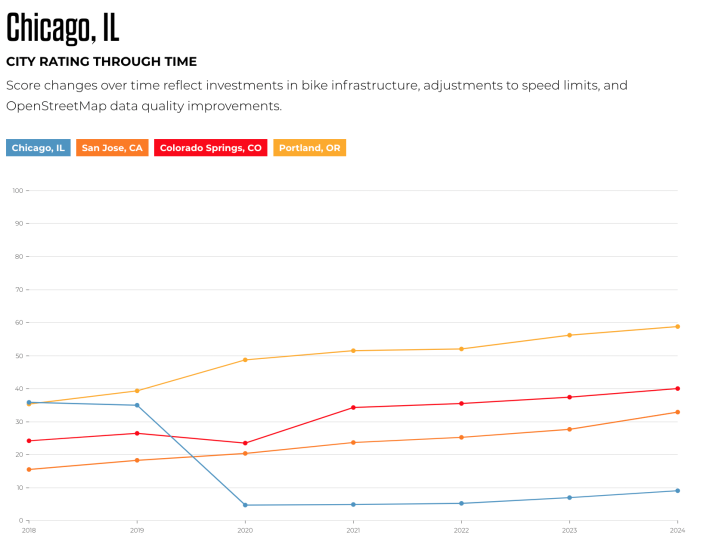 It sure does! What it illustrates is that in 2018 PFB considered Chicago to be essentially tied with Portland, OR, which currently has a City Rating of 59, or roughly 6.5 times our current nine-point score. But between 2019 and 2020, Chicago’s score dramatically plummeted, taking us from being rated one of the very best large U.S. cities for biking to one of the very worst. What the heck happened?