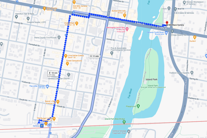 We walked first down the west side of Third Street, passing the pizza place Cotto A Legna, the gift shop The Little Traveler, the bakery Eye Candy, and the live music venue Even Flow. At State Street, Geneva’s main east-west street, we took a right and headed east toward the Fox River until we arrived at Mill Race Cyclery, 11 E. State St. The trip was a little under a mile.