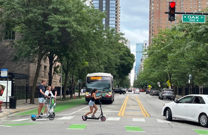 Even though it’s not completely finished yet, this part of Clark is a great addition to the bike network. As you can see from the images in this post, it’s already getting lots of use from bike and e-scooters riders. (The latter are also legally permitted to use Chicago bike lanes.)