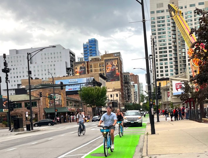 Riding on Chicago’s new all-green protected Clark Street “Brat Lane”