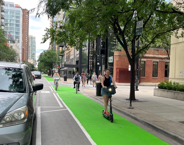 The recently installed protected stretch of Dearborn on the Near North Side includes plenty of light green paint, which is good for reminding motorists that they shouldn’t drive, stand, or park in it. Refreshingly, practically the entire in-progress Clark PBL is that lime-colored shade.