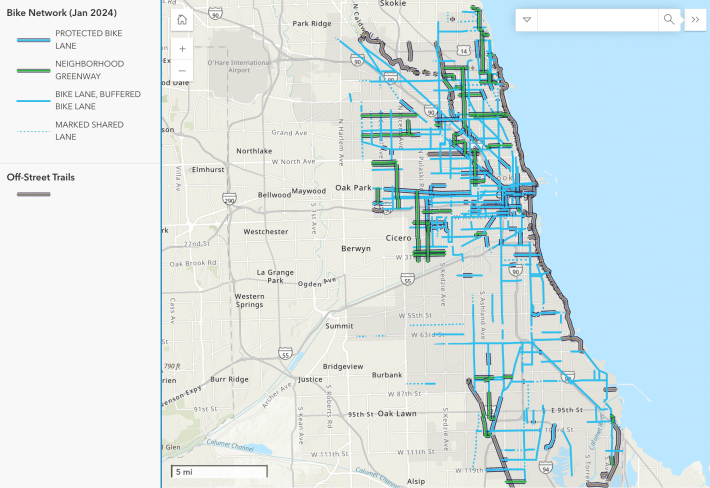As you can see from the department’s Existing Bike Network map below (click here for an interactive version), the West Side is starting to catch up with the North Side for bikeway mileage. But parts of Chicago south of I-55 are still lagging behind, especially when it comes to “lower-stress” bikeways like protected bike lanes and Neighborhood Greenways (side street routes), shown as the thicker blue and green lines on this map.