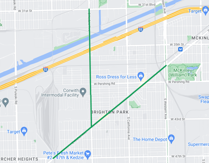 CDOT is planning safe streets upgrades on a 1.6 mile stretch of Kedzie between Archer (about 4330 S. here) and 31st Street, which crosses the expressway and the ship canal. The Archer segment goes 1.9 miles between 47th Street (Archer is about 3600 W. here) and Western Avenue (2400 W., Archer is about 3730 S. here).
