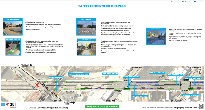 Archer Avenue would also get new left turns as part of a four-to-three converstion “road diet”, which CDOT notes will “keep traffic on the street flowing and… stop [drivers] from weaving in and out of [two lanes going the same direction.]” In addition, Archer would get slip lane closures at 47th and 28th streets, which would help prevent motorists from dangerously whipping around corners at high speeds.
