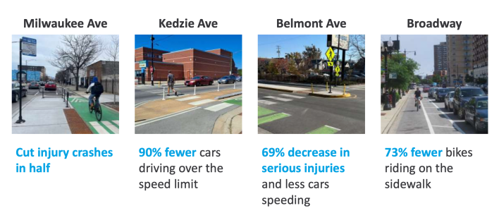 During the presentation, CDOT provided the following impressive stats from recent road diet and protected bike lanes projects on the North and Northwest sides, in neighborhoods like West Town, Logan Square, Avondale, and Uptown. This demonstrated how these strategies would make Southwest Side streets safer.