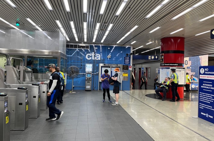 As my train approached the Racine station, our driver repeated the announcement and advised passengers who needed to get to Western to get off at that station and catch the CTA’s 7 Harrison bus. “Due to police activity at Western/Congress, all Blue Line trains will be bypassing the station,” she announced. “Right now, we don’t have the buses [for] the bus shuttles available because of the DNC and all the reroutes.”