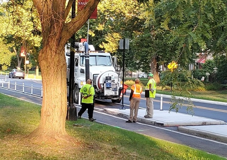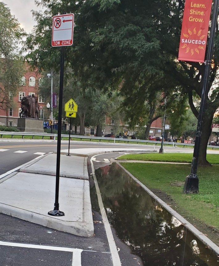 When Dan saw a water department crew visiting the flooding area recently, the workers told him fixing the problem would have to wait. “The crew said they needed to get that big truck over by the drain to clear it,” he posted on Facebook. “They didn’t want to drive over the concrete that divides the bike and car lanes, because the truck is very heavy and the concrete is ‘green,’ that is, it hasn’t had much time to cure and strengthen, and they worry that it might just collapse.”