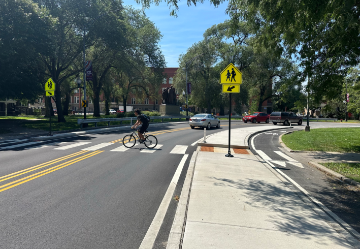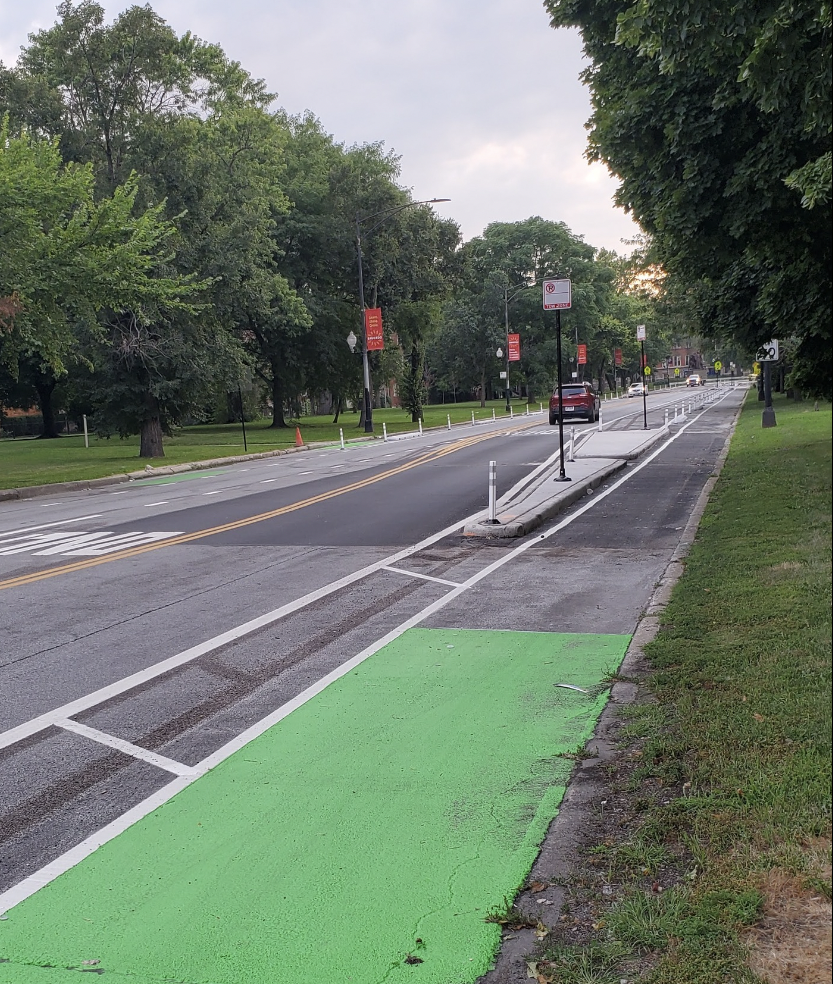 Just east of this stretch, directly in front of the school, the curb separation becomes a non-protected, de-facto parallel parking lane. If past years are any indication, Dan said he “strongly suspects drivers will continue to park illegally in the bike lanes, and even possibly on the concrete separators.”