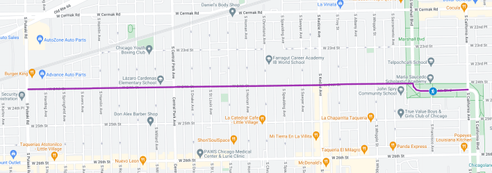 Here’s a rundown of the project, according to CDOT. On the one-way eastbound stretch of 24th Street between Pulaski (4000 W.) and Marshall (about 2900 W.), the department has striped a contraflow, “wrong-way” bike lane. This legalizes westbound cycling and helped make other road users more aware of westbound bike riders, which helps prevent crashes. The speed limit has been lowered to 20 mph. “This route connects to several important neighborhood destinations, including Lazaro Cardenas Elementary School, Farragut Career Academy, and John Spry Community School,” CDOT says.