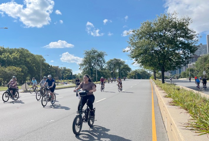 The drive was open to people on bikes from 6:30 to 11:30 a.m. on the 15-mile stretch between 59th Street in Hyde Park and Hollywood Avenue in Edgewater, the highway’s northern terminus. Roughly 15,000 people participated.