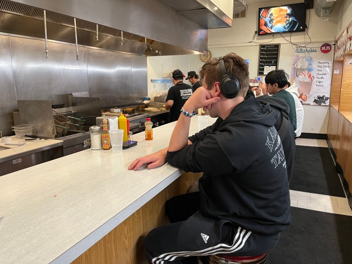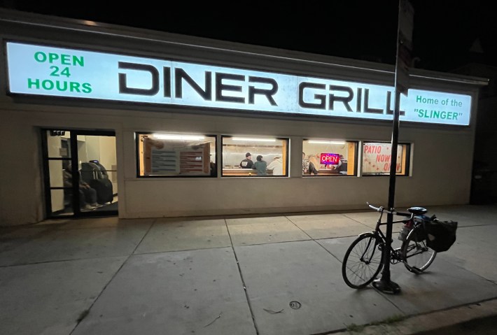 So I got up early today and biked a mile from Streetsblog Chicago HQ in Uptown to the 24-hour Diner Grill (try the “Slinger”!), 1365. W. Irving Park Rd., to buy some coffee around 3:30 a.m. Even in the wee hours, the place was pretty lively.