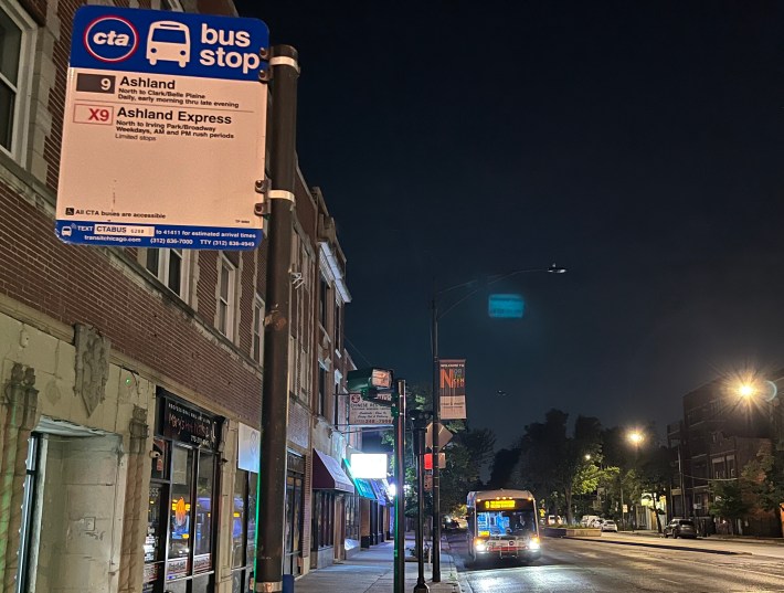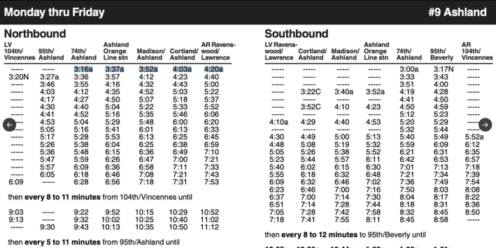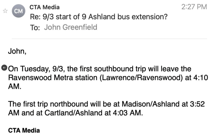 The new 9 Ashland timetable indicated, and a CTA spokesperson confirmed, that the first northbound bus to complete the new itinerary was scheduled to arrive at the Cortland Avenue stop at 4:03 a.m. today.
