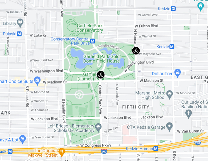 The crash report image, above, shows Ward’s bike as being at the southeast corner of Central Park Avenue and Washington. That’s the intersection just south of the Garfield Park Gold Dome Field House, shown at the top of this post. That image is a still from Streetsblog’s video of riding the concrete-protected bike lanes on Central Park, which the Chicago Department of Transportation installed last fall.