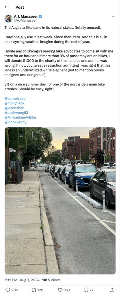 On August 8, 2024, Chicago real estate professional A.J. Manaseer, who lives on Augusta Boulevard in the West Town community, tweeted the following. “The Augusta [Protected] Bike Lane in its natural state… (totally unused). I saw one guy use it last week. Since then, zero. And this is all in peak cycling weather. Imagine during the rest of year.”