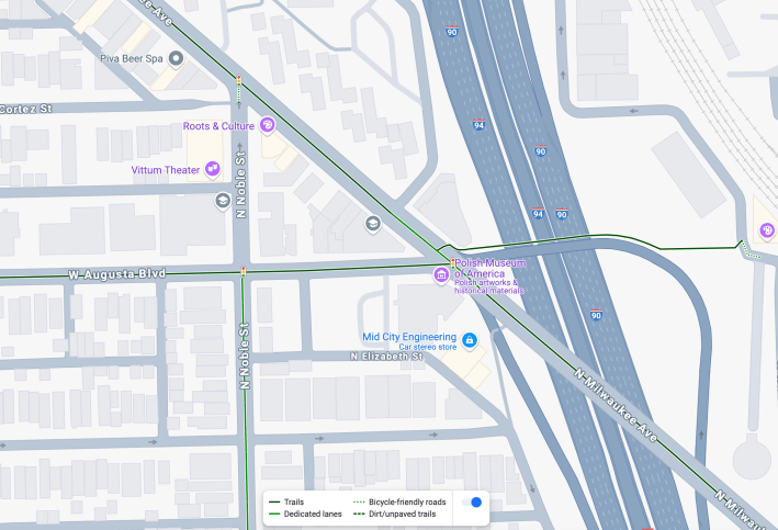 On the other hand, Milwaukee is a northwest-southwest diagonal street leading directly from recently bohemian Northwest Side neighborhoods like Logan Square and Wicker Park to the downtown Loop. Much of Milwaukee has protected lanes, and it’s Chicago’s busiest biking street, which is why some call it the “Hipster Highway“. So counting bikes on Augusta just west of Milwaukee worked to my advantage.