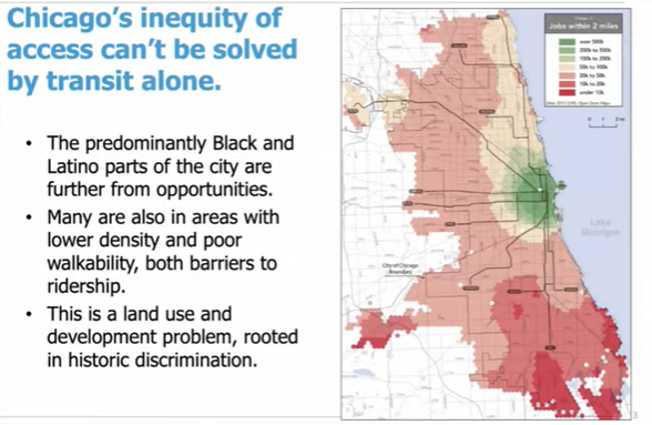 “Providing the same service to Black folks as white folks doesn’t go as far, because they have to go further,” he said. “Obviously, that’s a land use problem rooted in historic discrimination. CTA is deploying service as fairly as it can. It’s just the geography is creating the barrier to Black folks.”