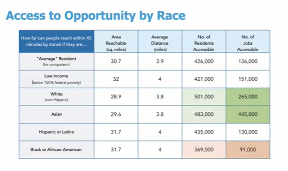 Walker also pointed to the “racial dimension of access to opportunities.” The route coverage doesn’t tell the whole story. Walker shared the analysis of census tracts that delved into how many jobs are located within two miles of a home. The numbers notably drop on the South Side and, to the lesser extent, the West Side and parts of North Side. He further broke the numbers down by race and found that Black and Latino residents can reach fewer jobs within 45 minutes from their homes than white and Asian-American residents.