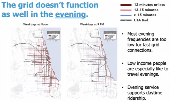 In his report to the transit board, Walker noted that buses account for 60 percent of CTA ridership, in large part because, unlike the Loop-orientated ‘L’ system, buses are “useful for going everywhere at all times a day.” But when it comes to serving the customers who rely on the bus network the most – working-class riders whose jobs can’t be done remotely – the current system has several shortcomings.