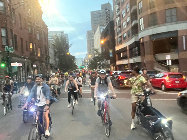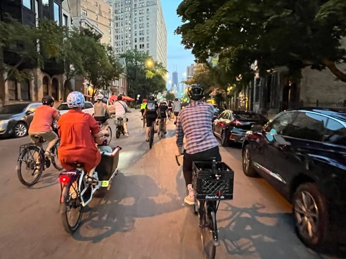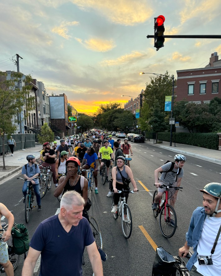 The ride assembled at 6:15 at Jonquil Park, 1001 W. Wrightwood Avenue. The large mass of riders made its way, mostly on Lincoln Avenue, southeast to the plaza.