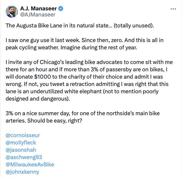 Granted, I wasn’t a fan of Manaseer’s language in an August 8 tweet in which he challenged local sustainable transportation advocates to prove that the Augusta Boulevard protected lanes aren’t an “an underutilized white elephant.”