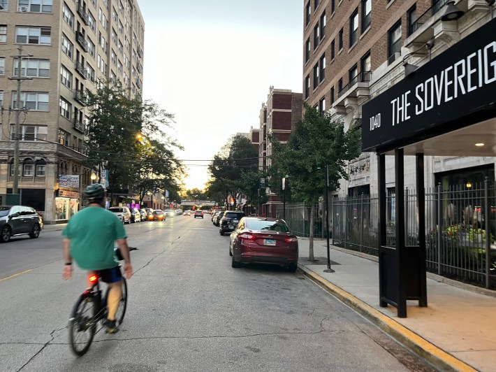 In this part of town, Sheridan is a high-speed four lane “stroad,” essentially an extension of DuSable Lake Shore Drive, where it’s dangerous to bike in the street. So until the City solves that problem, it makes sense to encourage bike riders to use Kenmore (northbound) and Winthrop (southbound), side streets with striped bike lanes, as safer alternatives.