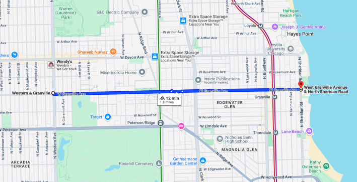 Wednesday evening I biked the 1.8-mile stretch of the possible Granville corridor between Western Avenue (2400 W.) and Sheridan Road (1000 W.) and shot video of the trip. My journey started in West Ridge, two blocks south of the Devon Avenue (6400 N.) South Asian shopping and dining district, and ended at the shoreline near Loyola University. As you might expect, I crossed paths with a diverse array of people riding bikes and scooters.
