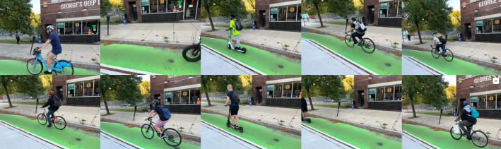 Still, one might ask, “Even if it’s not true that protected lanes scare away customers who drive, they don’t actually attract other patrons, do they?” Well, starting around 6 p.m. Wednesday evening, within 15 minutes I photographed ten bike and scooter riders passing by the Inside Publications office and the pizza parlor.
