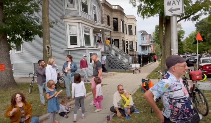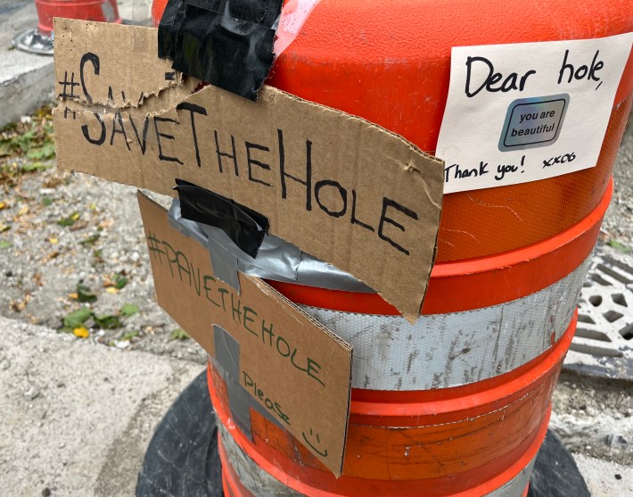Burton opened the show with a speech. “Hey Logan Square, welcome to the Hole,” he said. “Thanks for coming out to save our hole. This hole appeared here a couple of weeks ago, and we’re very proud of it now. We’re hoping this could be an example for the rest of City as a very cost-efficient measure to calm traffic.”
