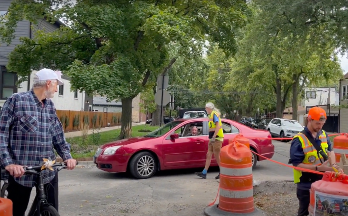 And it was clear that the avenue’s excavation, surrounded by orange traffic barrels, was doing its job to encourage slower car speeds. That became even more obvious as the celebration started, and motorists hit their brakes to check out the tunes.