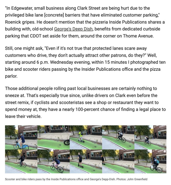 Last week I again had to debunk the spurious claim that protected bike lanes kill small businesses, when the Not In My Back Yard community newspaper News-Booster attacked the proposal for the Granville Avenue Greenway. Editor Ronald Roenigk also included a lengthy diatribe against the Clark Street PBLs in Edgewater, which – not coincidentally – pass right past his office. I don’t feel like spending any more brain power on that guy right now, so just check out this excerpt from my SBC response if you haven’t already.