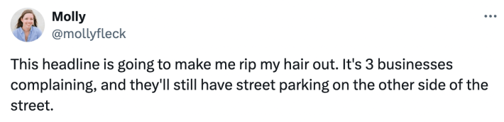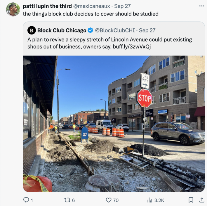 “Crews are removing parking to make the Lincoln Square stretch more accessible to cyclists and pedestrians,” the new Block Club subheading states. “Though the plan has neighbor support, some business owners say they’re in trouble — and one has already decided to close.”