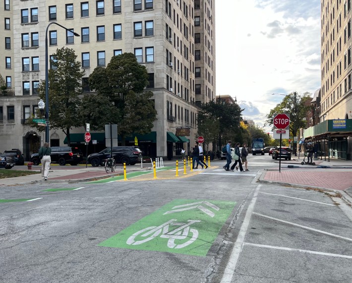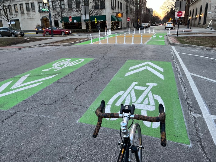 “The design hasn’t changed,” Chicago Department of Transportation spokesperson Erica Schroeder told Streetsblog today. “This is what was coordinated with the alderman based on the ward’s feedback and the available widths at the intersections.”