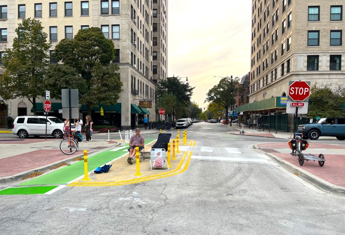 And the [47th Ward, represented by Ald. Matt Martin] is currently building a modal filter to allow cyclists to pass through that existing [cul de sac]. And when that is completed, there’s going to be a nearly four-mile, continuous stretch of greenway that starts up north in a neighborhood called Bowmanville, and will go all the way south to the Chicago River. And this greenway will connect to Berwyn Avenue, which is another greenway, it will connect to Roscoe Avenue, which is another greenway, it will connect to the protected bike lanes on Belmont Avenue. And these are all really critical east-west connections that allow people to travel through our entire city in a low-stress way.