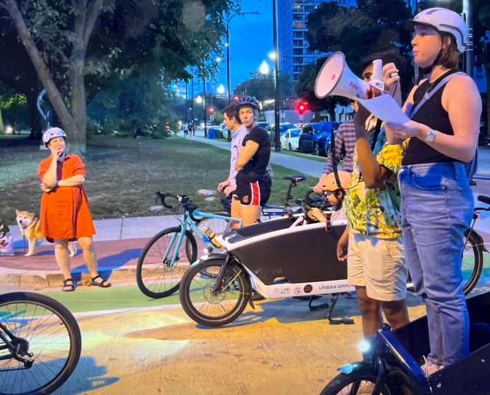Rony Islam is the cofounder of Chicago, Bike Grid Now!, which is pushing for a citywide network of low-stress, bike-priority routes. Molly Fleck is a sustainable transportation activist and bike mom who lives in the 43rd Ward. They both gave speeches at a protest CBGN! organized last month at the plaza, which drew some 150 bike riders.