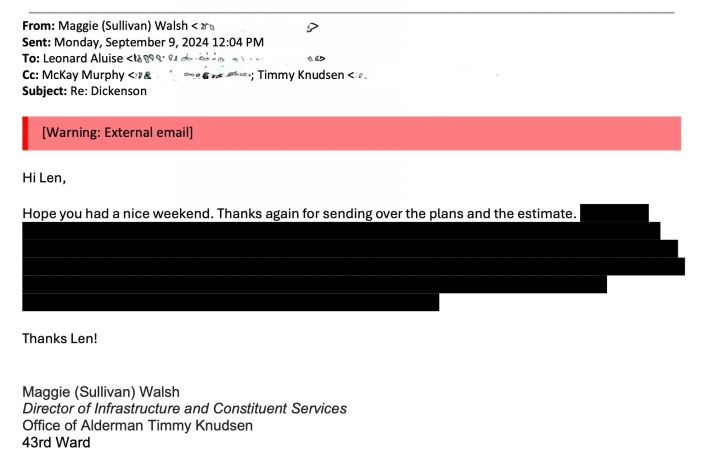 Translation: The FOIA response likely blacked out some of the juicier content in some of these emails, that may have revealed some smoking guns. For example, here’s the September 9 response to Aluise from 43rd Ward Director of Infrastructure and Constituent Services Maggie (Sullivan) Walsh. (I blurred out the email addresses as a courtesy.)