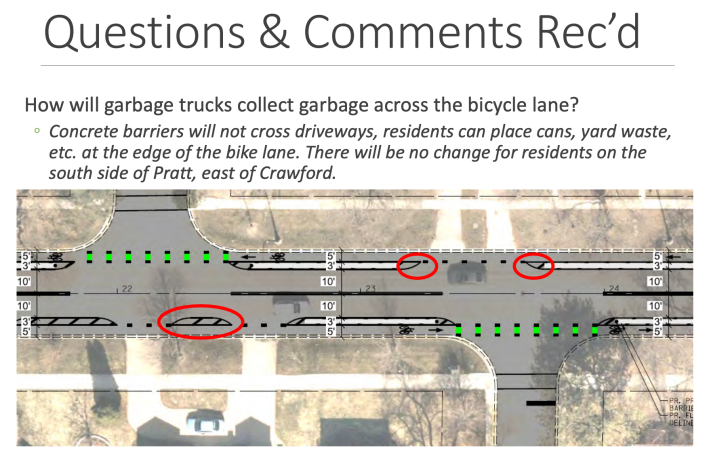 Another meeting attendee, who said he doesn’t live in Lincolnwood but bikes through it, pointed out the difference between paint-only and protected bicycle lanes. “Protected bike lanes are a much better, safer option,” he said. “Studies show that those are safer for [drivers] and pedestrians [because they calm traffic and shorten crossing distances], and [bike riders].” He urged the board to keep that fact in mind, both on Pratt and when considering bike lane proposals in the future.