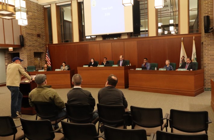 Another person who spoke before the board said he lives on Pratt and is also an avid bicyclist. He too opposed installing concrete barriers and flexible plastic posts for driver convenience and aesthetic reasons. But he said he is in favor of Option #2. “Thank you very much for… incorporating bicycle safety by having a painted line, and considering the restrictions and the complications that the residents have come forth with.”