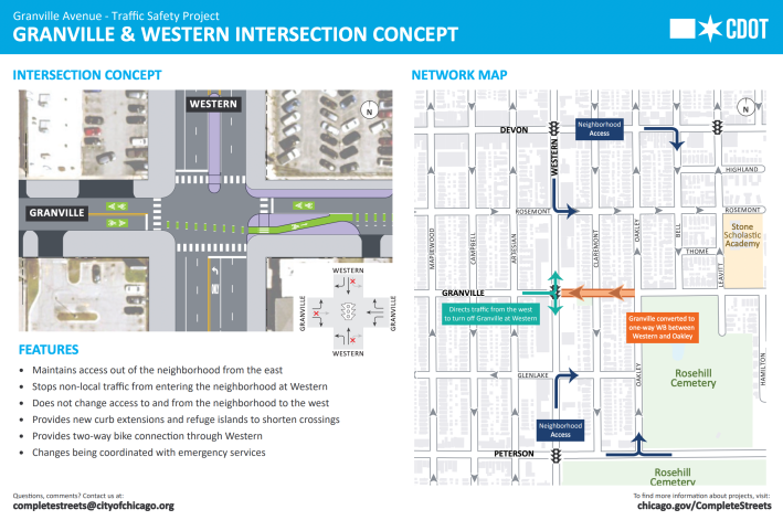 In a nutshell, CDOT is proposing to address heavy traffic, frequent crashes, and sometimes-terrifying speeding incidents on a nearly three-mile stretch of Granville between Kedzie Avenue (3200 W.) and Sheridan Road (1000 W.) Drivers are currently treating Granville, a residential street, like a highway. So the goal is to encourage safer behavior, and make it impossible to use the avenue for “cut-through” crosstown motor vehicle trips.