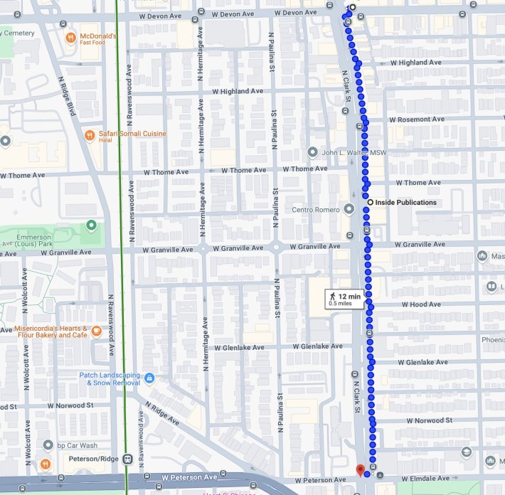 What makes this situation even more bizarre is that Roenigk’s place of business, the Inside Publications office, is located just north of Granville. How the heck did he not know that Devon and Peterson, the next two major east-west streets north and south, are each only about a five-minute walk from his office, not a ten-minute stroll? Oh right, maybe he drives everywhere.
