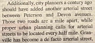 Anyone with a basic grasp of Far North Side geography could think about this passage for a minute and understand why it’s ludicrous. I actually agree with Roenigk that it’s reasonable “for arterial streets to be located every half mile,” which is the general rule in Chicago. However, he argues that “Peterson [6000 N.] and Devon [6400 N.] avenues… are a mile apart,” so it makes sense for Granville [6200 N.] to be used as a main street because it’s located half a mile from both Peterson and Devon.