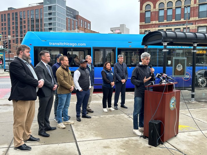 The City held a press event yesterday at Chicago Avenue and Milwaukee Avenue in West Town. The former is one of our city’s highest-ridership bus routes, while the latter is its busiest biking street.
