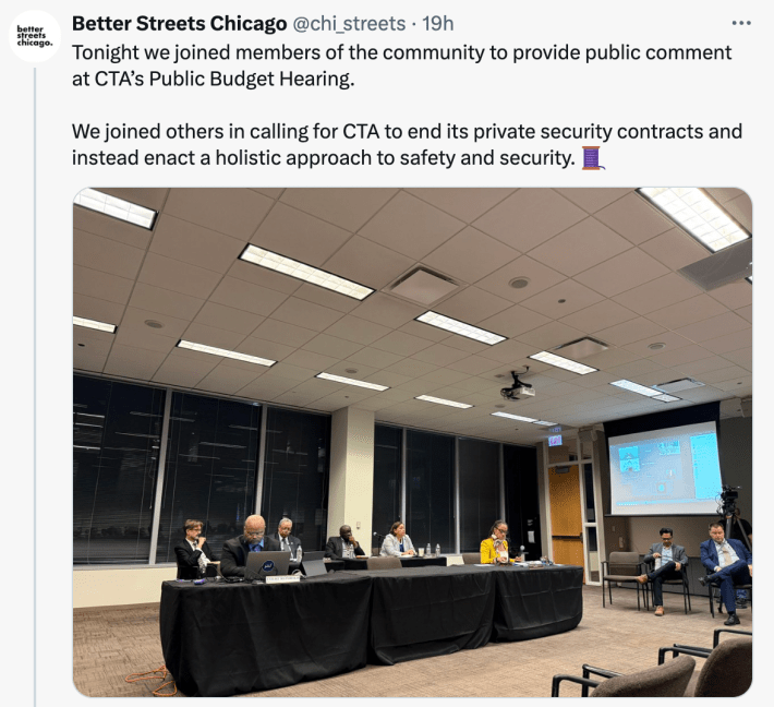 Kyle Lucas, executive director of the advocacy group Better Streets Chicago, was among several speakers who argued that the current private security and K-9 guard dog units are ineffective. “You can ask just about any rider in the community, and they don’t feel like it makes them any safer,” he said.