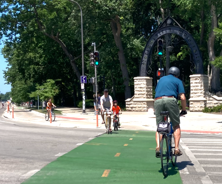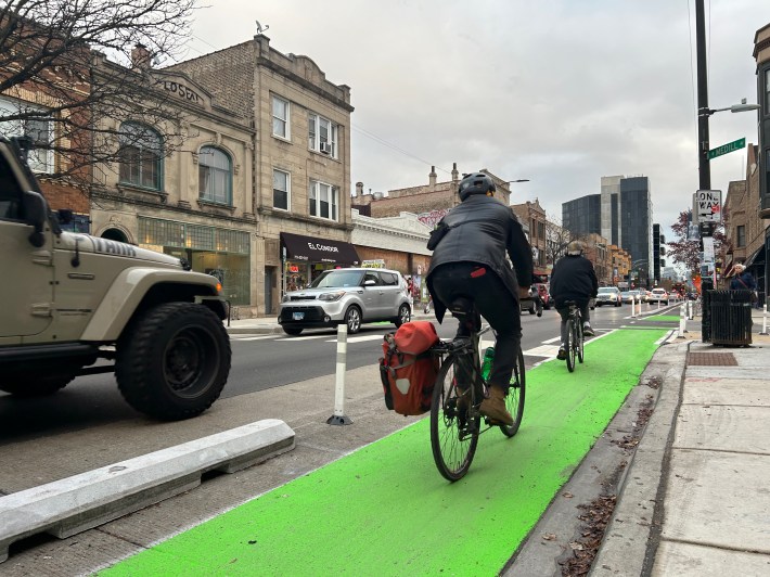 Contrary to what you might gather from Seidenberg’s article, it appears many Evanstonians are in favor of the protected bike lanes. Most of the 18 comments below the piece this afternoon voiced support for the project. One cited Streetsblog’s previous discussion of the benefits of converting parking to protected lanes in other cities.