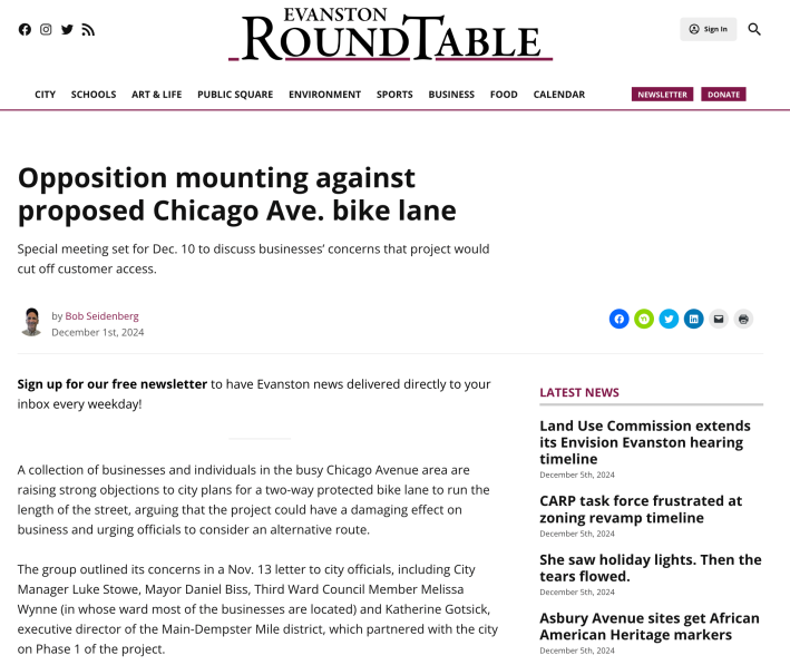 Fanning the flames of the Chicago Avenue controversy was an article by Bob Seidenberg published last Sunday on the Evanston RoundTable news website, “Opposition mounting against proposed Chicago Ave. bike lane.” (The title of this Streetsblog post includes a tongue-in-cheek spin on Seidenberg’s headline ā more on that in a bit.)