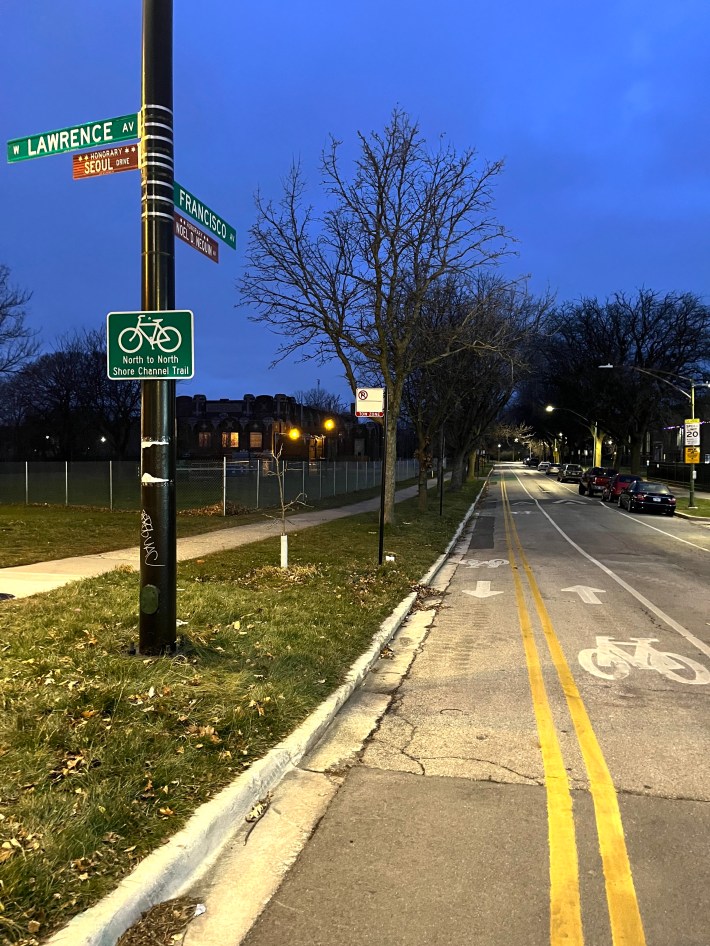 I planned to attend a Tuesday evening public meeting on Evanston’s Chicago Avenue project, which calls for extending the suburb’s Chicago Avenue protected bike lane south to the city of Chicago border. The hearing took place at Robert Crown Community Center, 1801 Main St. Therefore, I planned Tuesday’s Bike Lane Fest trip to take me from Streetsblog Chicago HQ in Uptown, to the north-of-the-border hearing, and back again. I’ll post a writeup the PBL meeting in the near future.