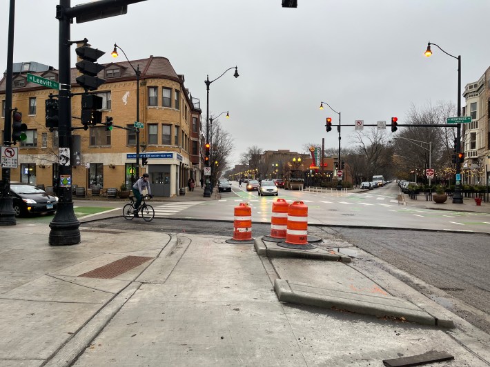 After I tweeted about the project this morning, I immediately got a text from a staff member from the local 47th Ward, represented by sustainable transportation-friendly Ald. Matt Martin. “[When you visited on Sunday,] you missed it by just a day or two!” the staffer said. “The Leavitt/Lincoln cul-de-sac got repaved Monday and it’s rideable now (but not yet striped.)”