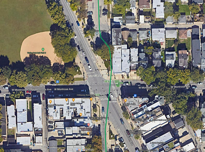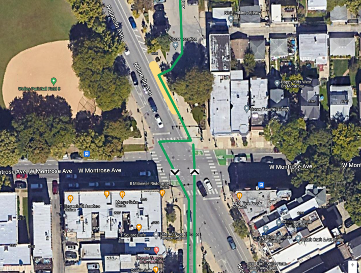 It’s generally a nice, low-stress, two-way cycling and scooter rank. But the fly in the ointment has been the spot where Leavitt crosses Montrose Avenue (4400 N.) and Lincoln Avenue (a diagonal street) in the Lincoln Square neighborhood.