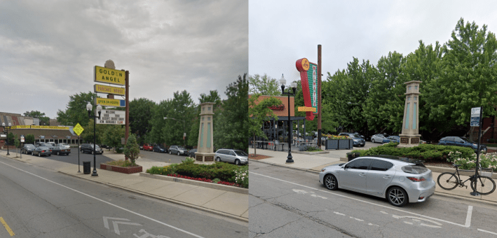 Speaking of this Lou Malnati’s, besides being located next to a Neighborhood Greenway, the pizzeria has another cool attribute. When it was built in 2014, replacing a Golden Nugget pancake house, the diner’s parking lot was replaced with outdoor seating. As you might predict, some neighbors complained at the time that this swap would create an on-street parking crunch. But the change seems to have worked out just fine.