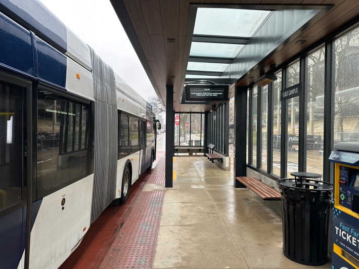 What was particularly noticeable, however — and a big reason why I wanted to try Rapid Route — was the speed and efficiency. In the section where I boarded along Washington Avenue, buses run in an exclusive center lane, free of other vehicles. The intersections were modified to ensure car drivers have left turn signals so they wouldn’t turn left across the path of a bus going as fast as the street’s speed limit.